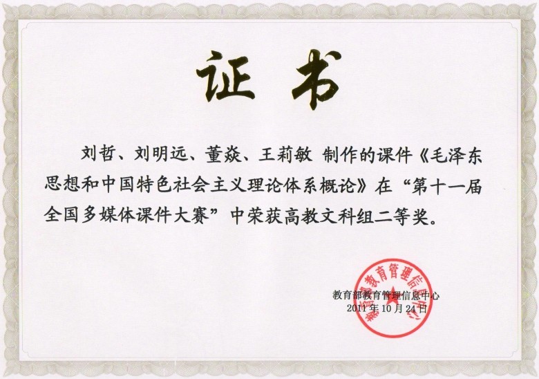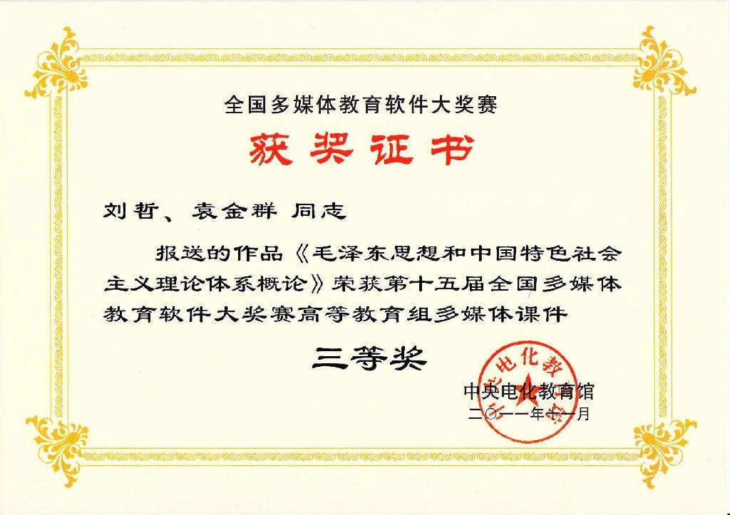 11月15日,由教育部指导,中央电化教育馆主办的“第十五届全国多媒体教育软件大奖赛”在京落下帷幕,思政部教师刘哲、袁金群制作报送的《毛泽东思想和中国特色社会主义理论体系概论》课件获高教组多媒体课件三等奖。 此前,由思政部教师刘哲、刘明远、董焱、王莉敏等老师制作的《毛泽东思想和中国特色社会主义理论体系概论》多媒体课件,代表公司参加了“第十一届全国多媒体课件大赛”,通过陕西赛区初审、复赛和2011年10月22-23日在北京举行的现场决赛,荣获高教组二等奖。