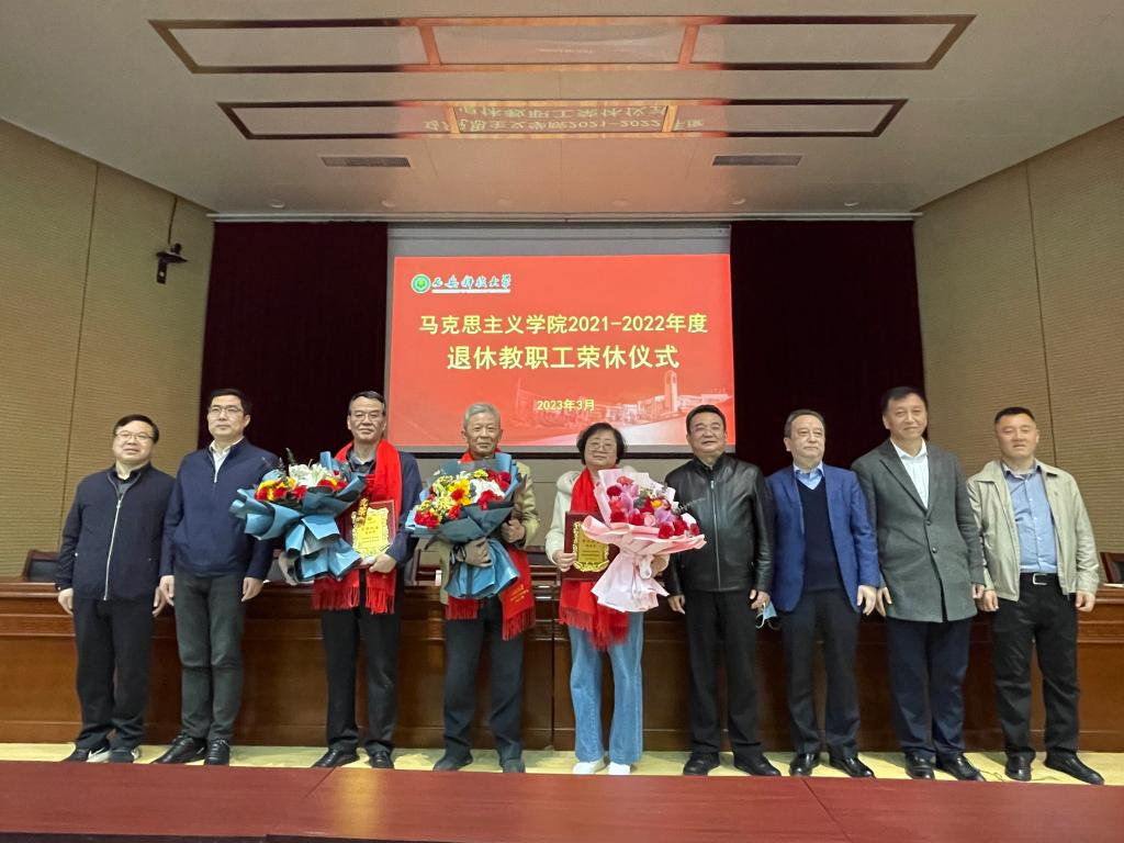 3月15日,beet365在雁塔校区北院主楼报告厅举办2021-2022年度退休教职工荣休仪式。公司党委副书记樊建武、公司党政班子成员、院2021-2022年度退休教职工、分工会主席、马院全体教职工、员工代表共计70余人参加会议。会议由公司党委书记贾哲主持。