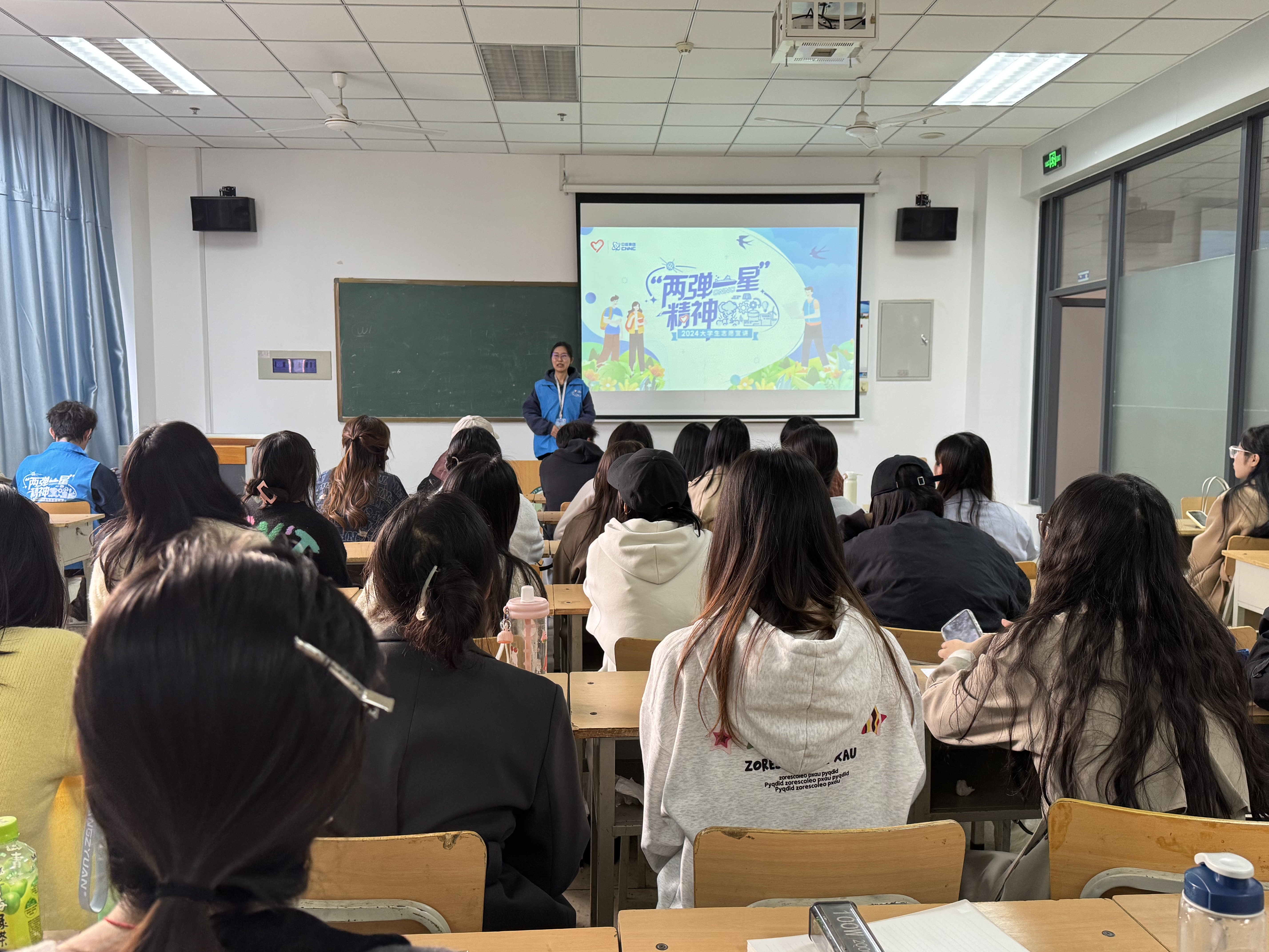 接着,宣讲团团员朱洁对“两弹一星”的产生背景、历史意义和时代价值作了详尽而细致的阐述。通过讲述老一辈科学家在极端困难的环境下,自力更生,成功研制出原子弹、氢弹、人造卫星等先进技术的动人事迹,深深打动了每一位同学。他们都表示,要以老一辈科学家的高尚情操为榜样,为我国科学技术的独立发展做出应有的贡献。