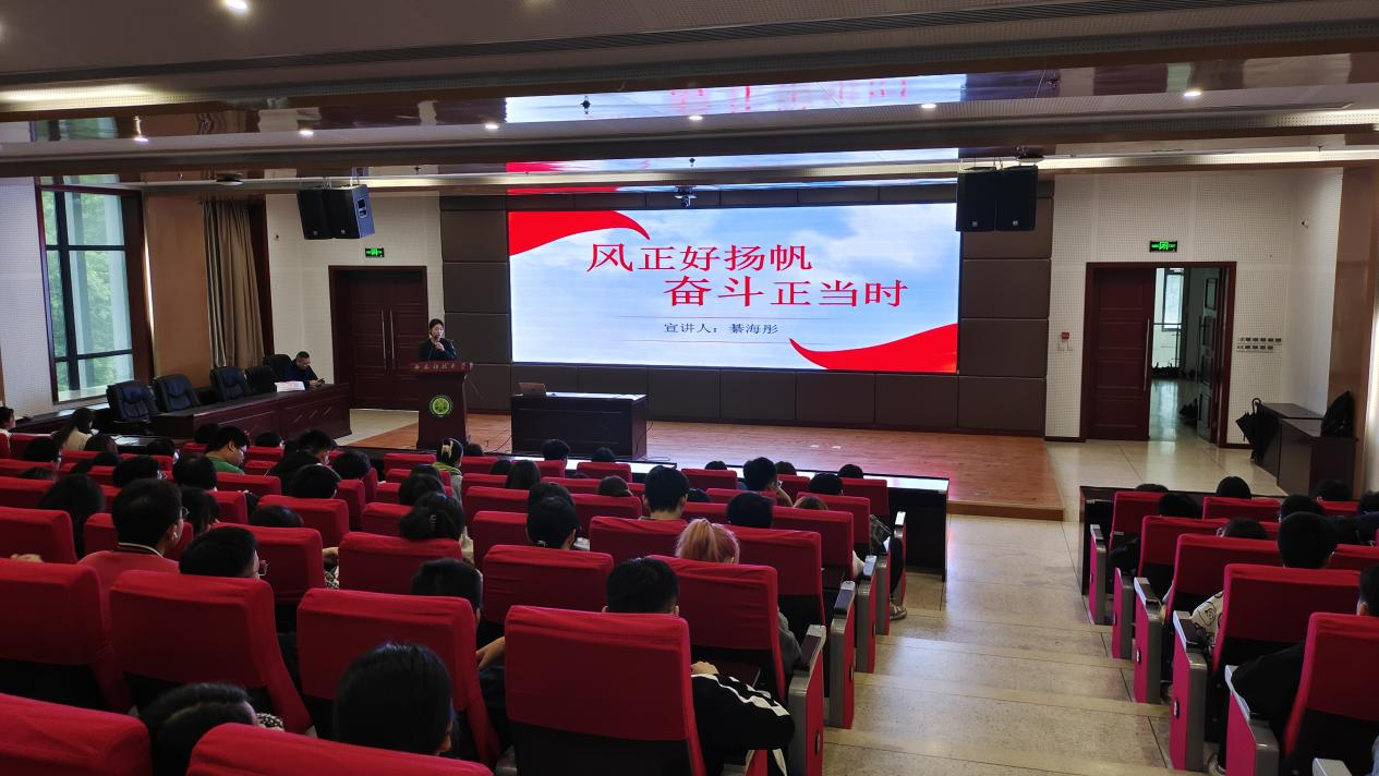 红言宣讲团成员綦海彤作《风正好扬帆,奋斗正当时》主题宣讲。分别从习近平总书记寄语新时代青年时强调的“坚定理想信念,站稳人民立场,练就过硬本领”三方面展开宣讲。她号召青年学子要以实现中华民族伟大复兴为己任,坚定理想信念,站稳人民立场。