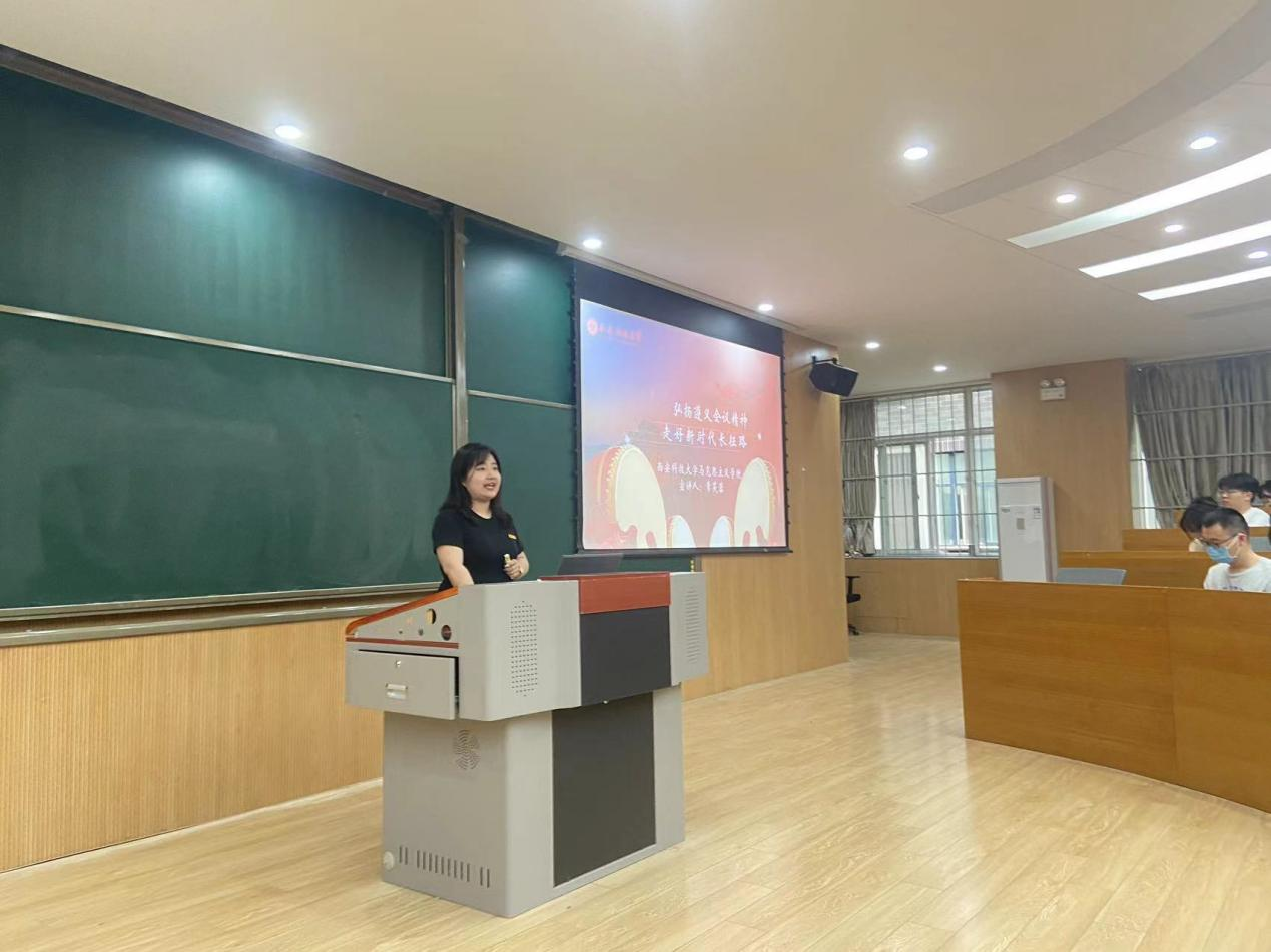 红言宣讲团成员常芙蓉同学以《弘扬遵义会议精神,走好新时代长征路》为主题,介绍了遵义会议的内容和重要历史地位,指出遵义会议在把马克思主义基本原理同中国具体实际相结合、坚持走独立自主道路、坚定正确的政治路线和政策策略、建设坚强成熟的中央领导集体等方面留下的宝贵经验和重要启示。