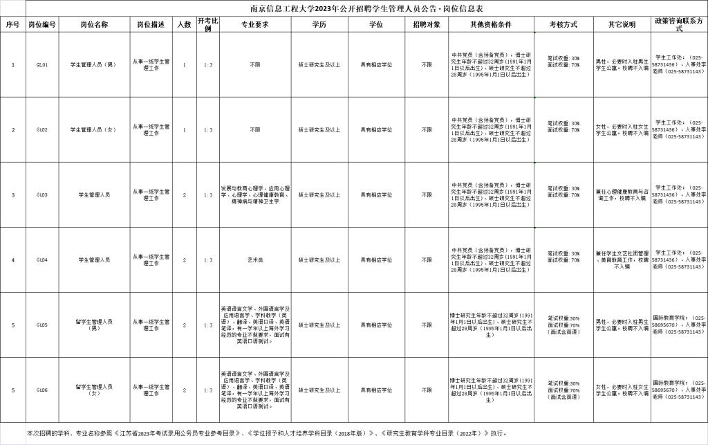 应聘员工管理人员(GL01-GL04):学工处顾老师025-58731436;